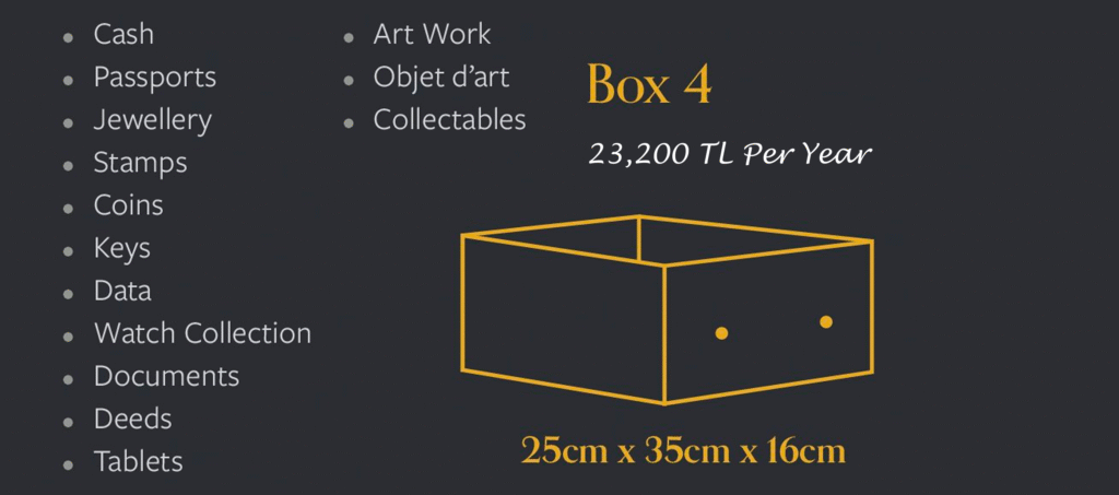 box THREE is a bit larger than the second box. It can store both documents and small valuables like jewelLEry, keys, and coins. It’s also spacious enough to accommodate art objects.